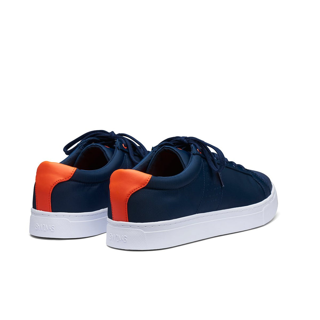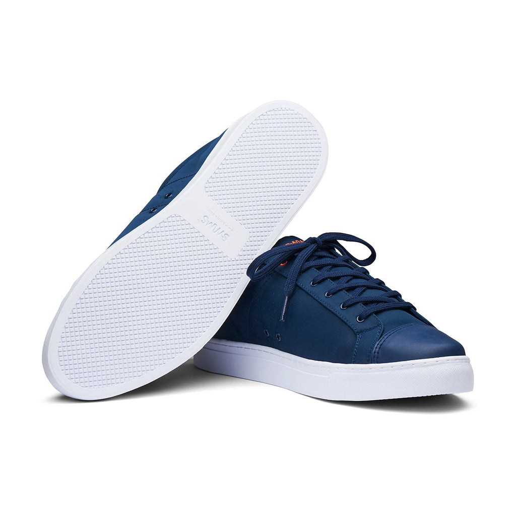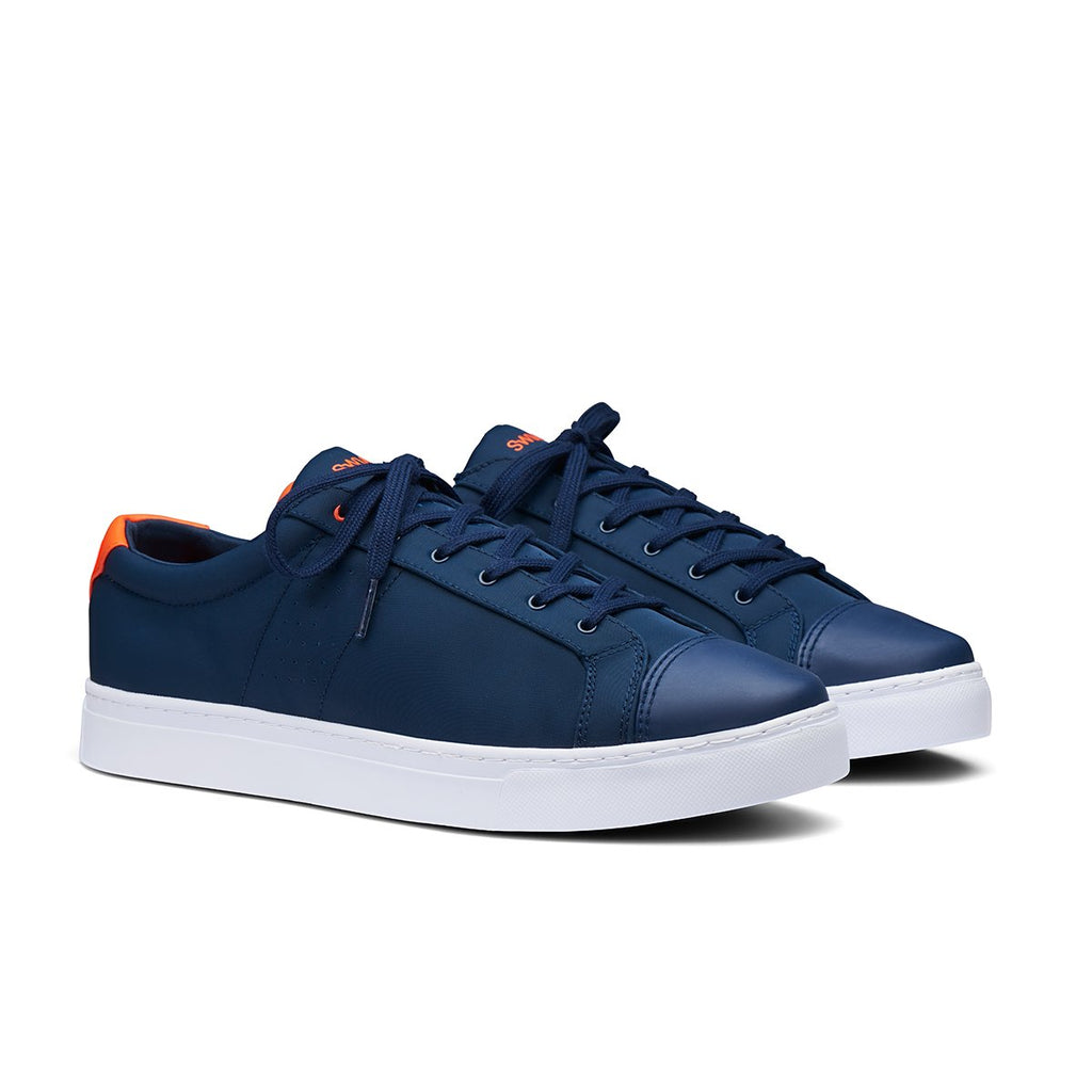 A new SWIMS icon, meet the water-friendly nylon Legacy Sneaker with a sleek cap toe and stitched side stripe. Further luxe details include a leather heel, SWIMS printed logo, signature orange top grommet and side vents for a breezy, breathable sense of style.