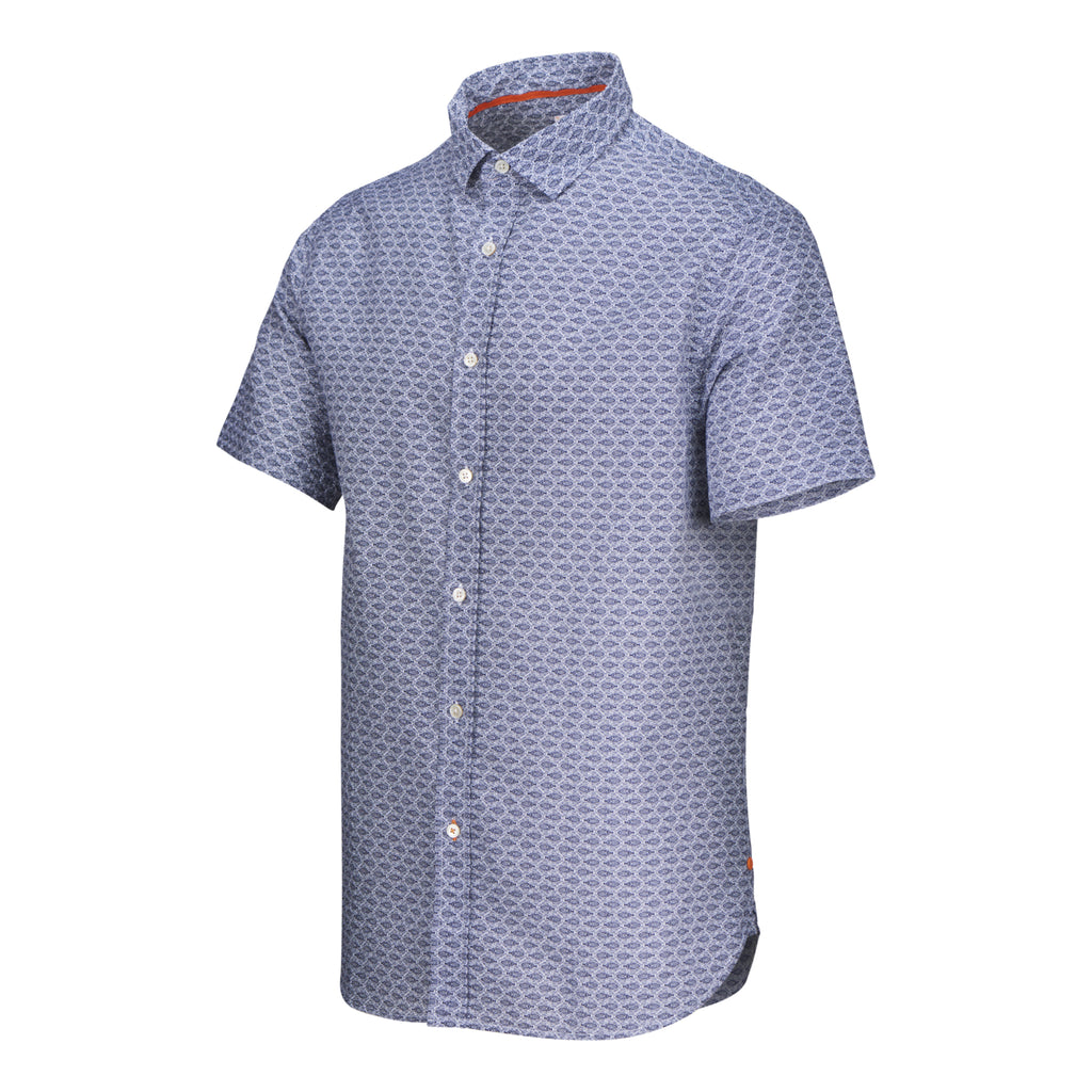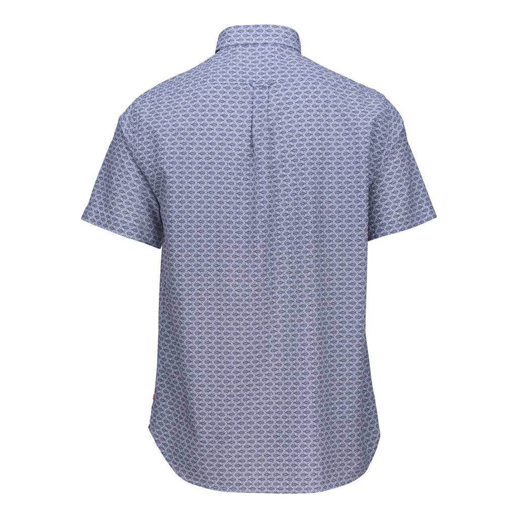 The Sorrento Printed Seersucker Shirt is a classic summertime essential made from a lightweight seersucker fabric. The relaxed fit makes it ideal to wear on its own or under your favourite blazer for dressier occasions. A micro fish pattern in light shades of navy adds a whimsical detail to your look whether you’re at the beach or to dinner on a warm summer night.